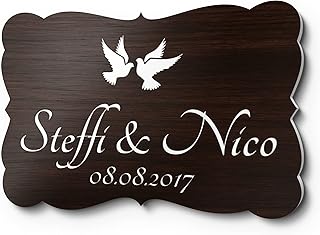 Hochzeitsschilder Holzoptik aus Kunststoff mit Namen oder Spruch & Motiv zB Traupaar für die Hochzeitsbank | Persönliches Geschenk zur Hochzeit | Wetterfest witterungsbeständig (Retro 2)
