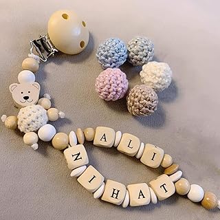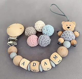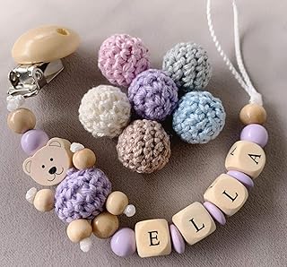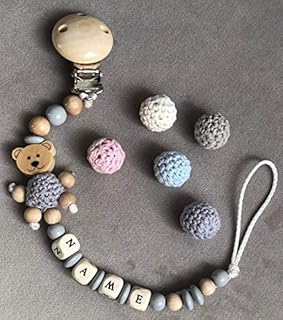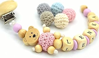 Schnullerkette mit Namen Teddy Bär HäkelperleNatur Holz Mädchen und Junge