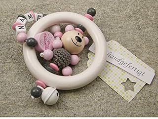 Baby Greifling Rassel Beißring mit Namen - individuelles Holz Lernspielzeug als Geschenk zur Geburt Taufe - Mädchen Motiv Bär und Herz in rosa