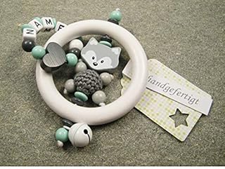 Baby Greifling Rassel Beißring mit Namen - individuelles Holz Lernspielzeug als Geschenk zur Geburt Taufe - Mädchen Jungen Motiv Fuchs und Herz in mint
