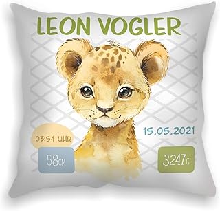 wolga-kreativ personalisierbares Geburtskissen mit Füllung Löwe Geburtskissen Kissen Namenskissen Geschenk Geburt Taufe Baby Kissen-Bezug weiß für Jungen Mädchen flauschig